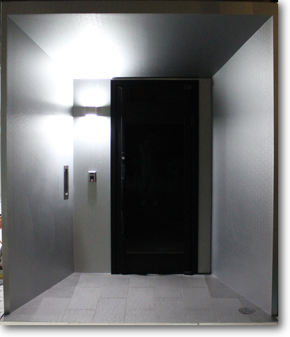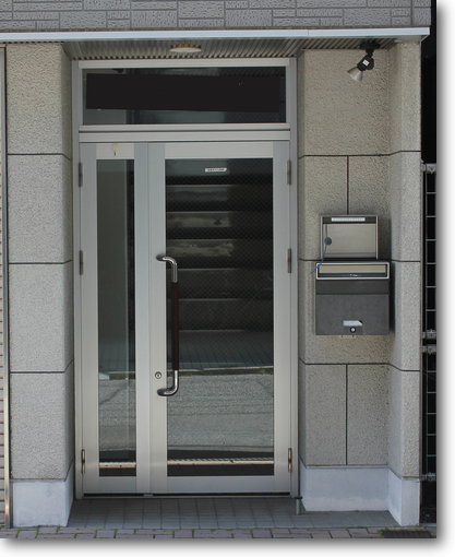 玄関は大判タイルと断熱ドアのミニマルな構成。